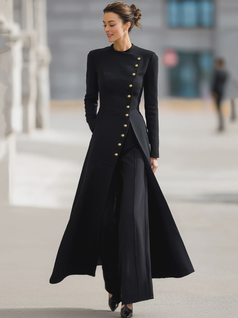 This sophisticated black long blazer and trousers set offers a modern take on classic tailoring. The coat features a high collar and a row of gold-tone buttons that add an element of luxury and structure. Its extended, flowing silhouette creates an elegant and powerful visual, perfectly complemented by the wide-leg trousers that add to the refined aesthetic.