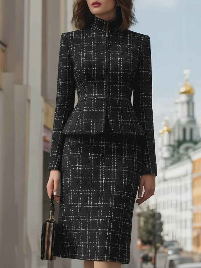 This refined two-piece set pairs a structured jacket with a coordinating pencil skirt, presenting a polished aesthetic ideal for professional and formal settings. The jacket features a high stand collar, clean zip-front closure, and a sculpted peplum waist that enhances definition and brings a modern edge to the traditional grid pattern.