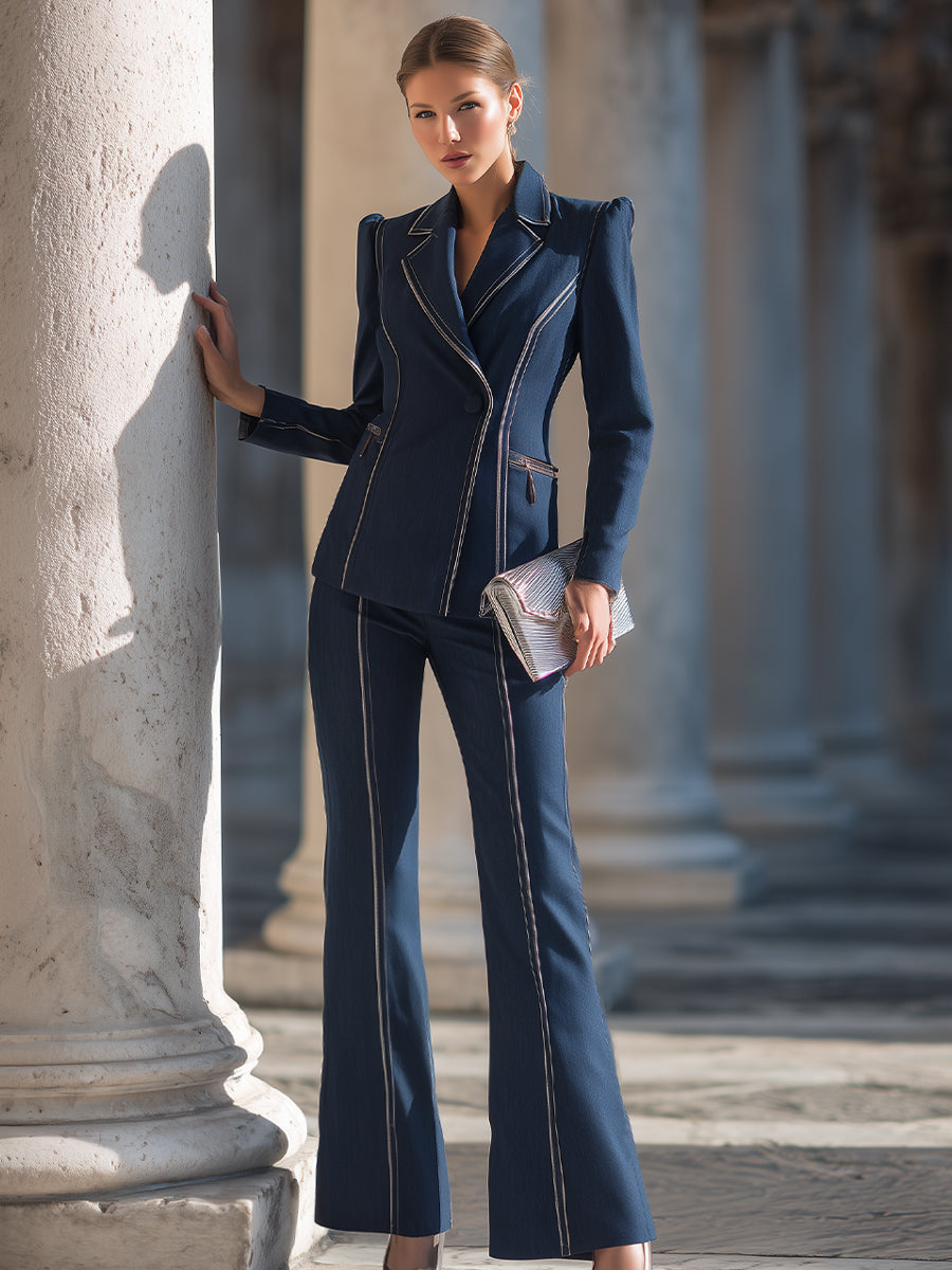 Tailored Contrast-Stitched Blazer And Flared Pants Set