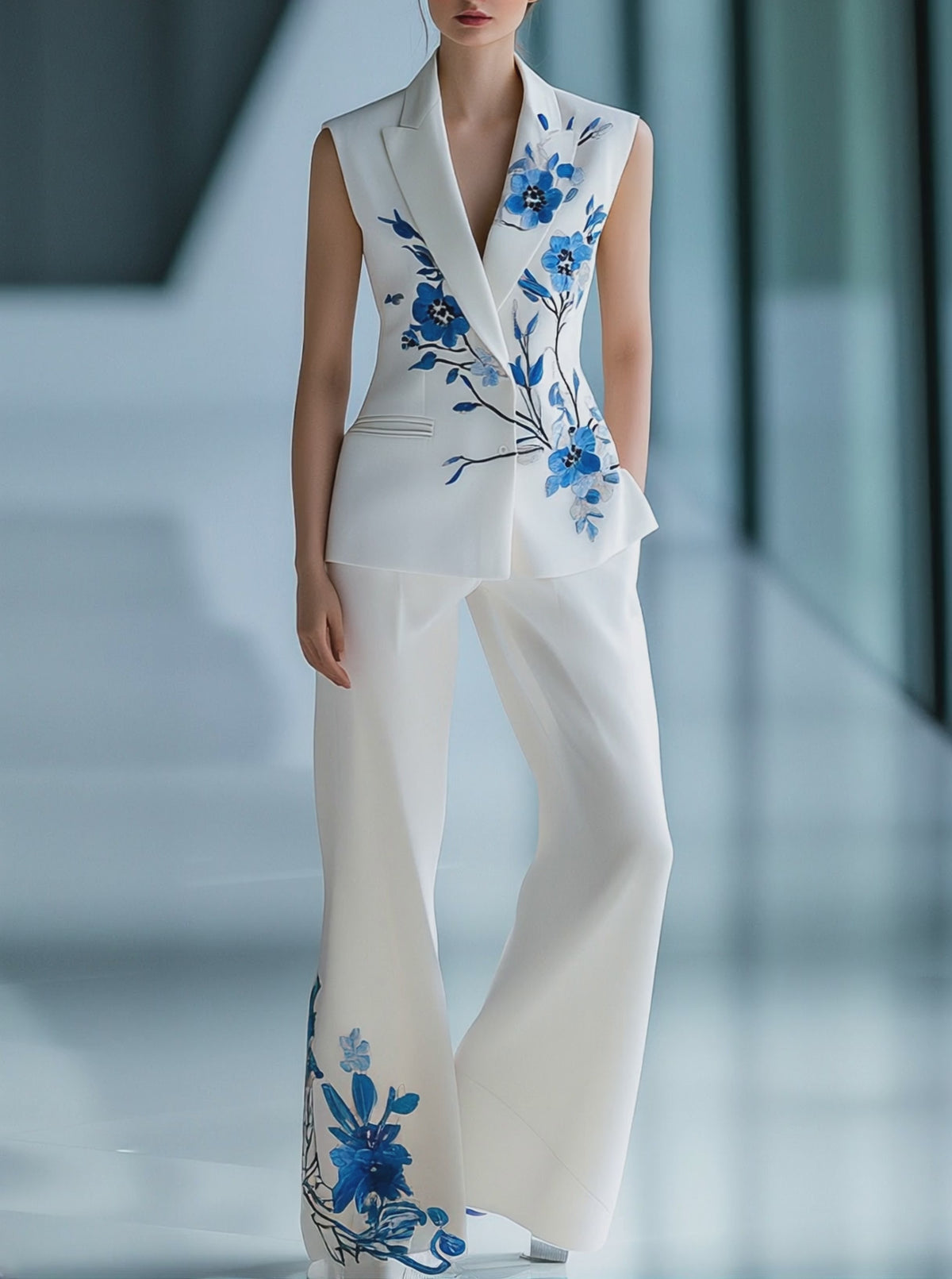 Urban Sleeveless Floral Printed Blazer and Trousers Set