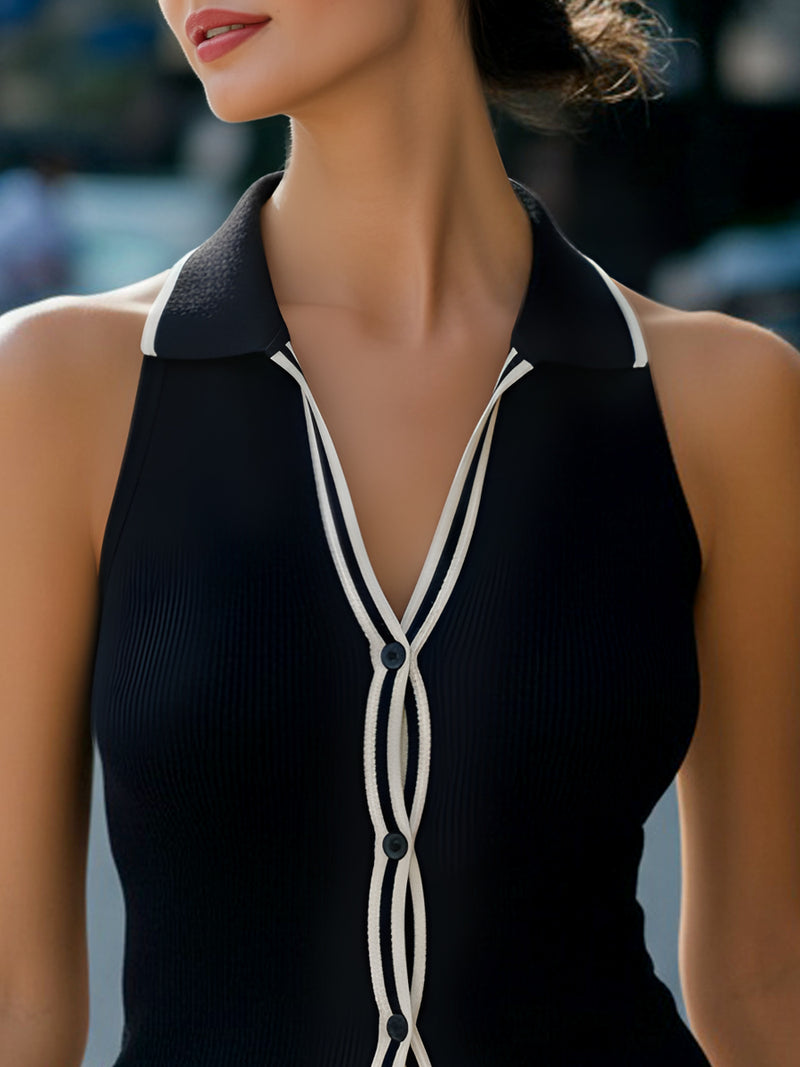 Contrast-Trim Sleeveless Knit Vest With Button Detail