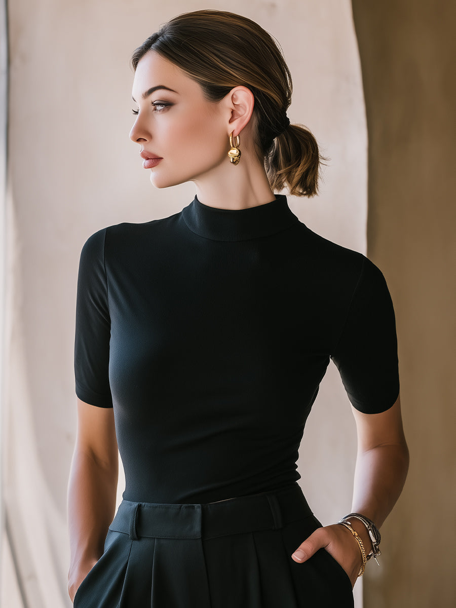 This mock neck slim-fit short-sleeve top is a modern wardrobe essential crafted for women who value precision, versatility, and refined minimalism. Designed to elevate everyday dressing, it offers a sleek silhouette that complements both tailored and relaxed styling. The structured mock neckline provides a clean, contemporary finish while subtly elongating the neck for a poised and confident appearance. Its understated design makes it ideal for professional environments, offering a polished alternative to traditional crew or scoop neck styles. The short sleeves maintain balance, providing coverage while keeping the overall look light and streamlined.