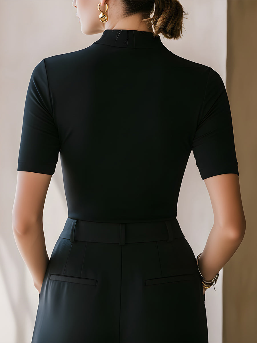 This mock neck slim-fit short-sleeve top is a modern wardrobe essential crafted for women who value precision, versatility, and refined minimalism. Designed to elevate everyday dressing, it offers a sleek silhouette that complements both tailored and relaxed styling. The structured mock neckline provides a clean, contemporary finish while subtly elongating the neck for a poised and confident appearance. Its understated design makes it ideal for professional environments, offering a polished alternative to traditional crew or scoop neck styles. The short sleeves maintain balance, providing coverage while keeping the overall look light and streamlined.