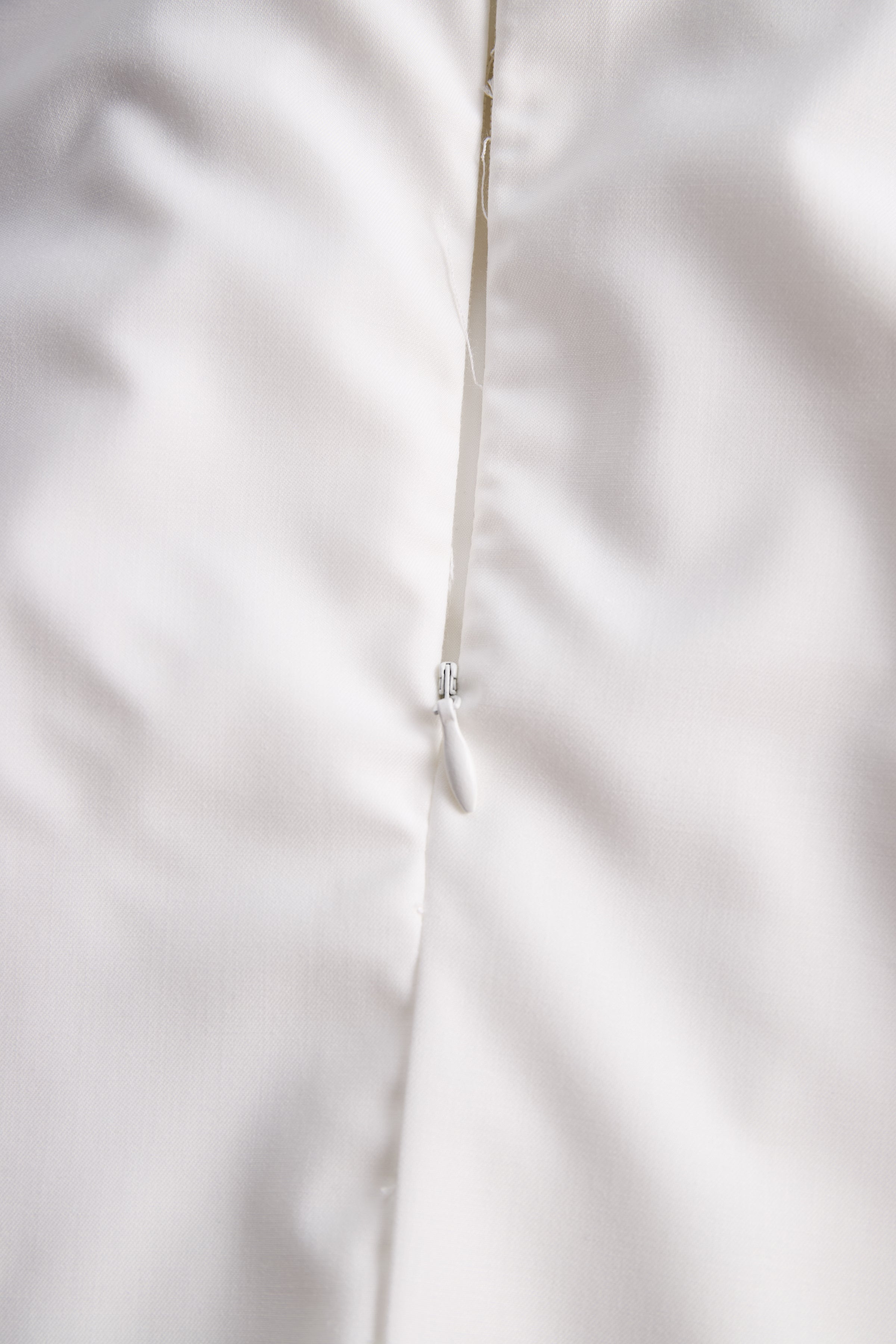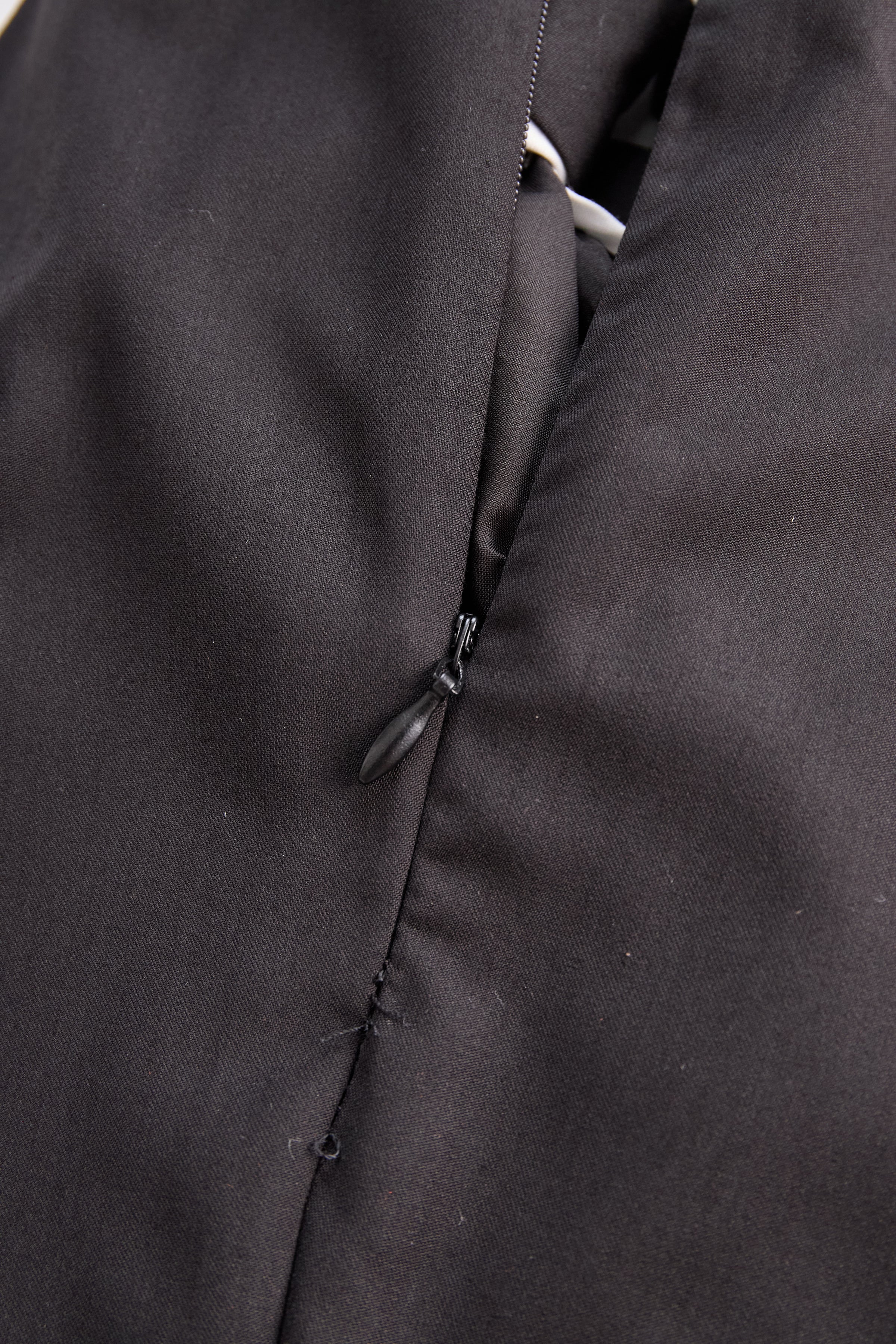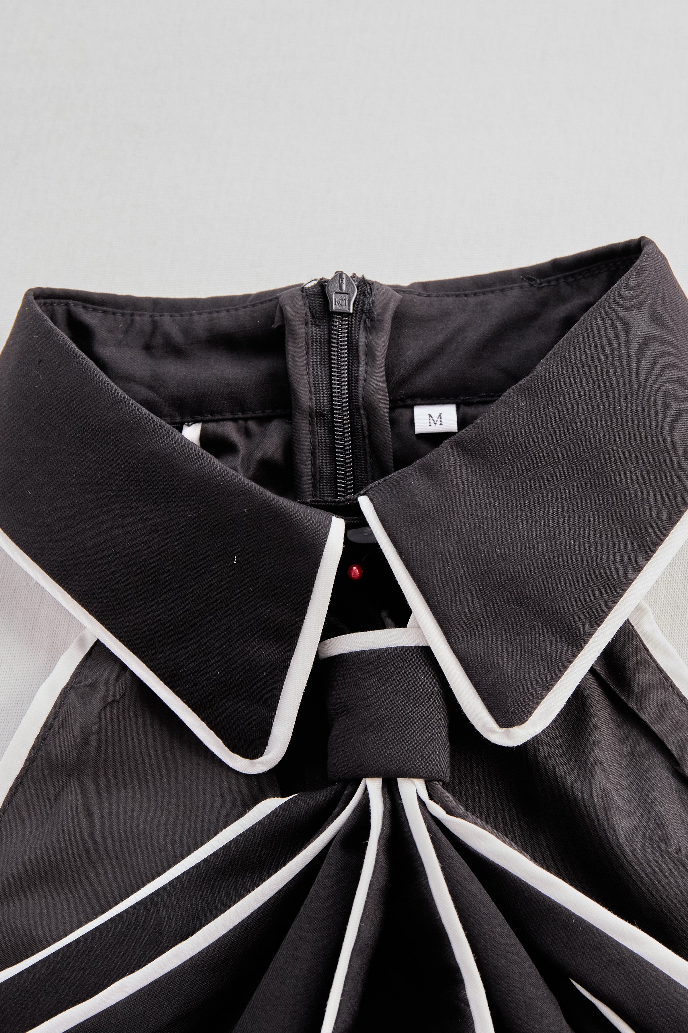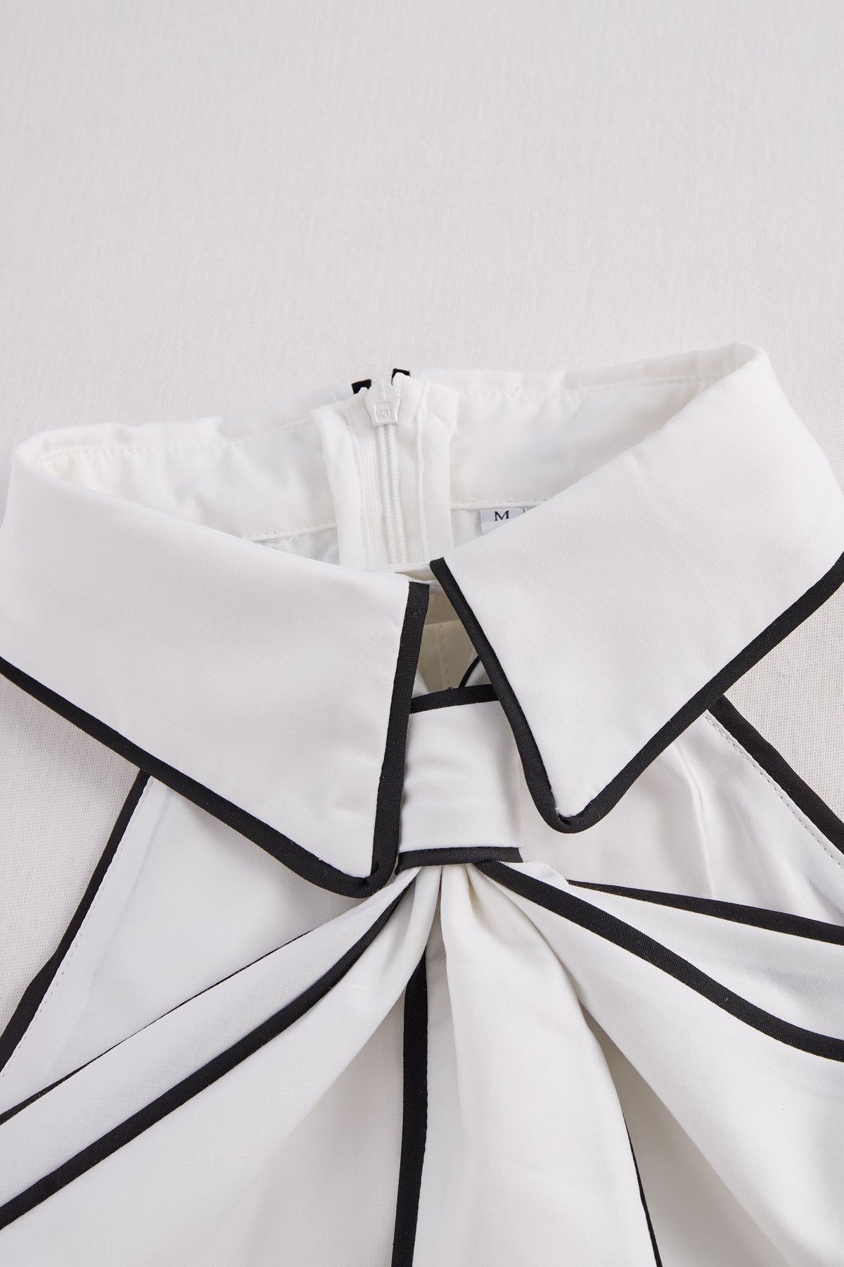 • Design: Halter neck with wide collar, center tie detail, bold black contrast piping