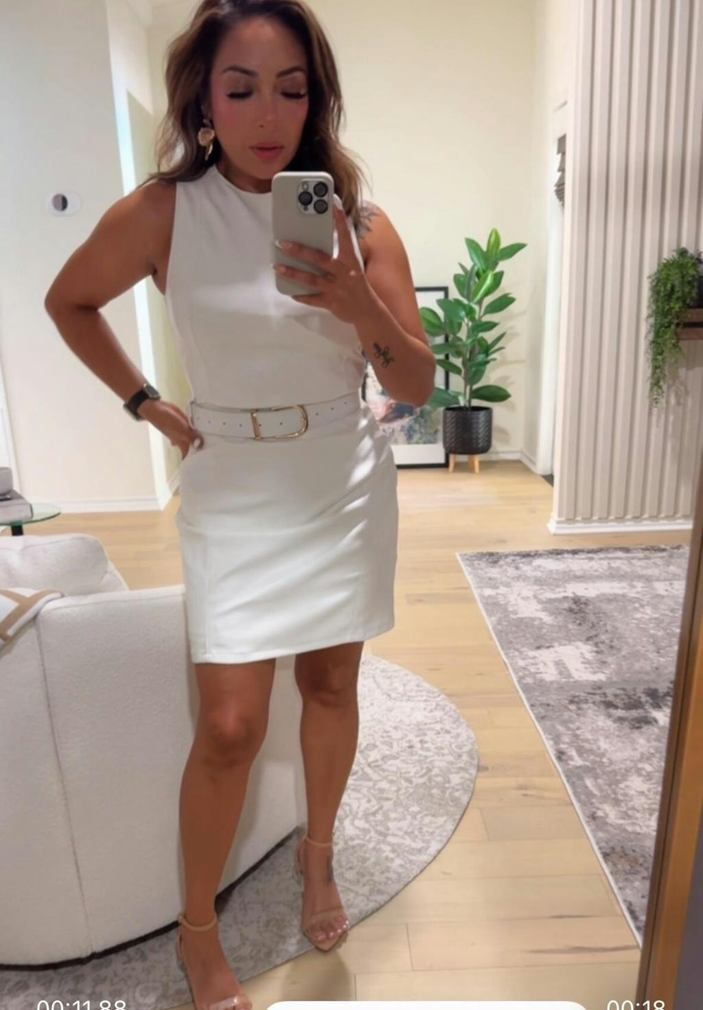 Elevate your look with this white faux leather mini dress, designed with a structured sleeveless silhouette and a high neckline for modern elegance.