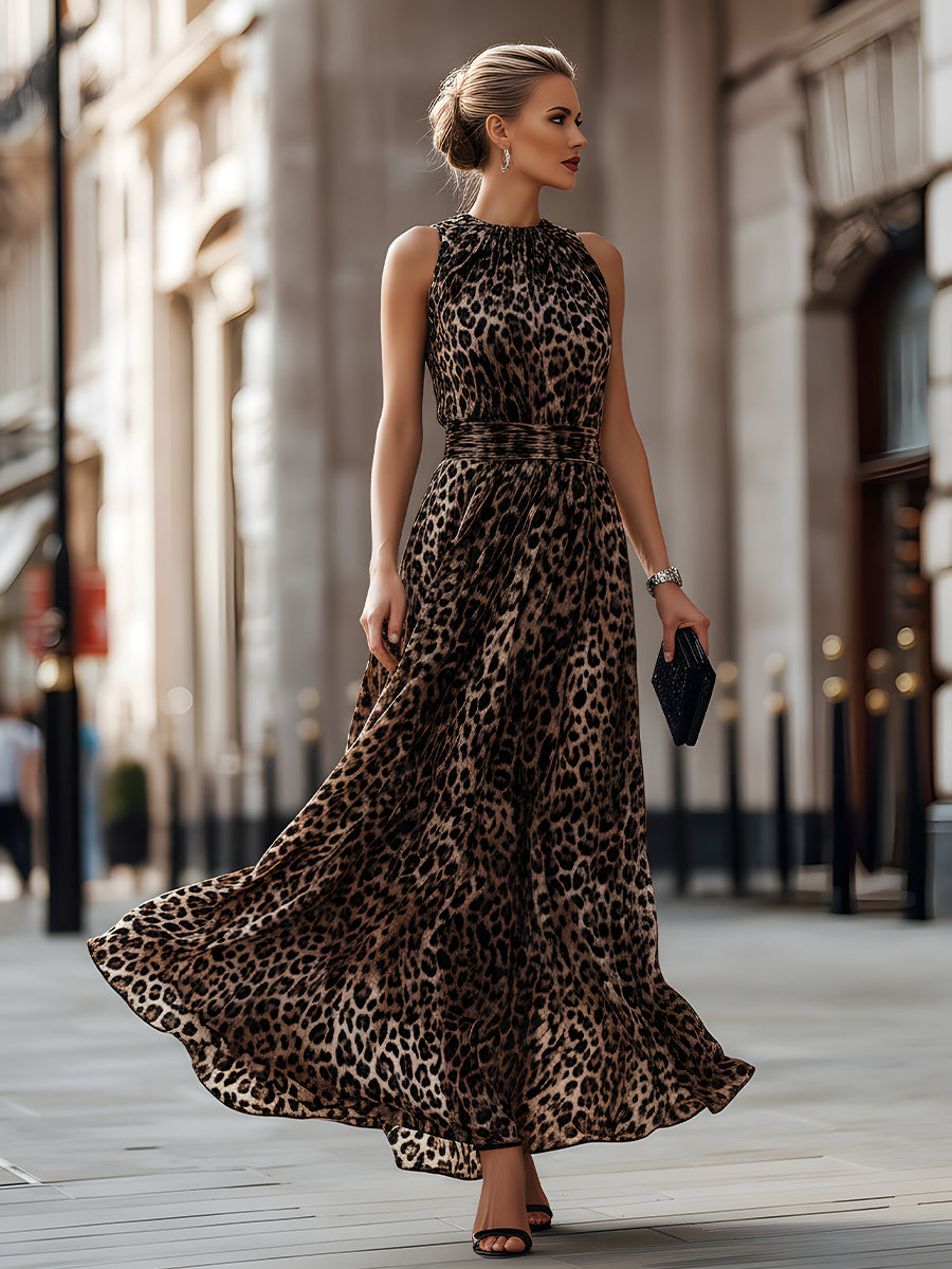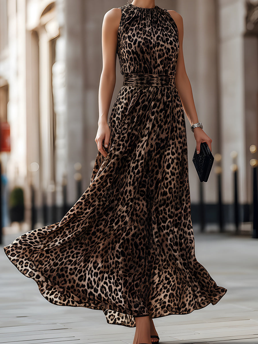 • Design: Sleeveless silhouette with high neckline, softly gathered bodice, defined waist shaping, and flowing maxi-length skirt with all-over leopard print