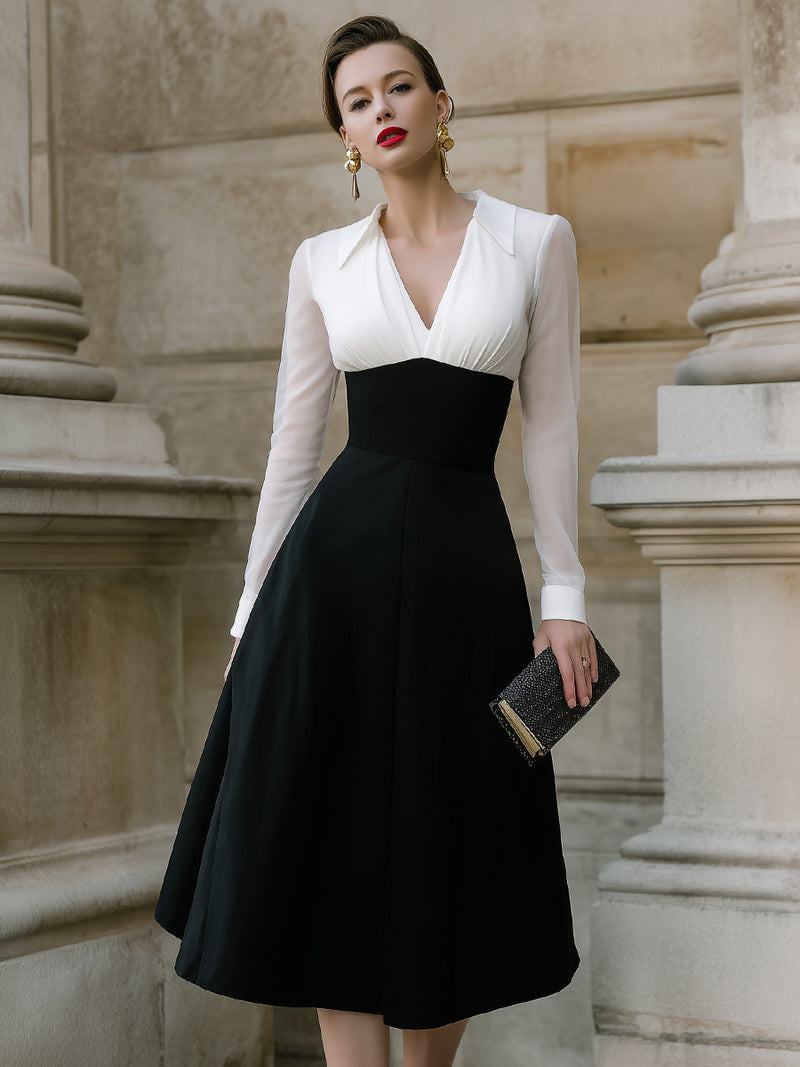 Deep V-Neck Gold Trim Long Sleeve Midi Dress