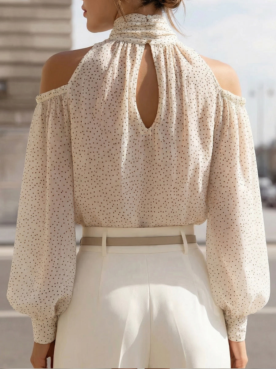 This elegant polka dot blouse brings a refined sense of movement and femininity to modern wardrobes. Crafted from lightweight chiffon, it features a soft drape that flows effortlessly with every step, creating a graceful and airy silhouette.The design highlights a cold-shoulder cut that subtly reveals the shoulders, balancing sophistication with a touch of contemporary allure. A gathered neckline adds gentle volume to the bodice, while the integrated scarf tie elongates the neckline and introduces a timeless, Parisian-inspired detail.