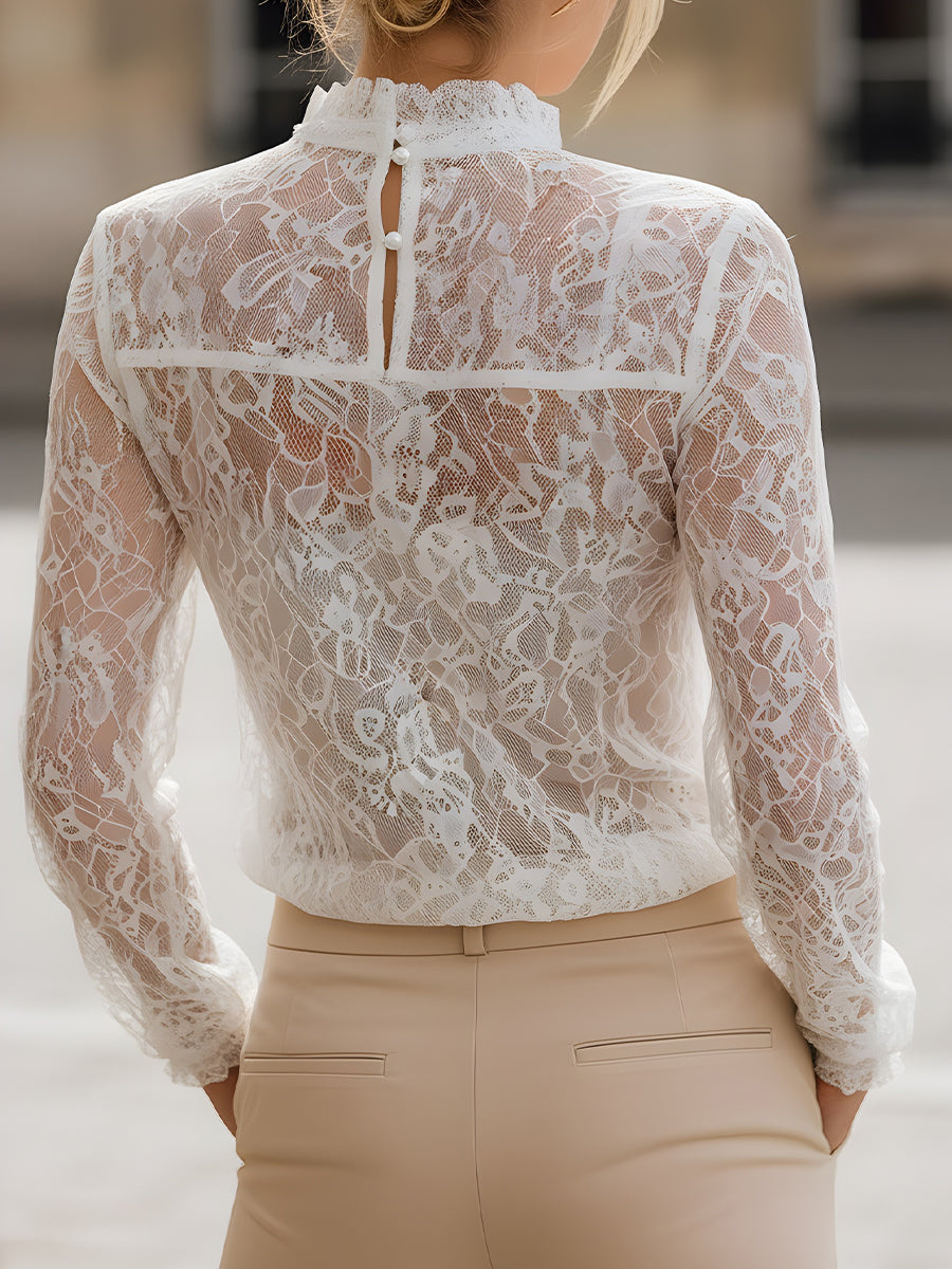 Sheer Lace Long-Sleeve Blouse With Delicate Trim