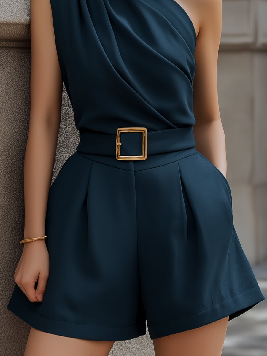- Design: One-shoulder silhouette, high wrap collar, diagonal draped bodice, defined waistband with statement buckle, tailored pleated shorts.