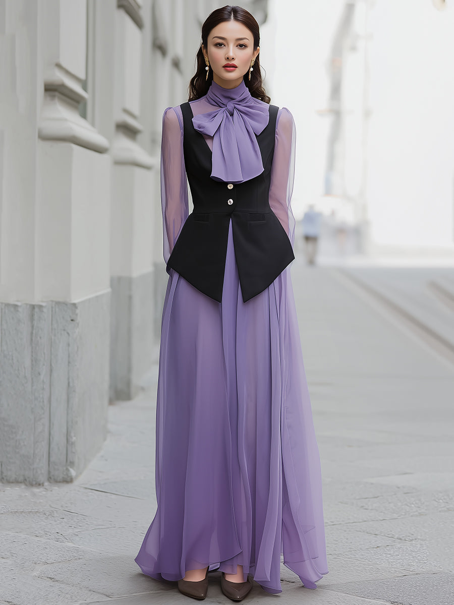 Elegant Lavender Bow-Tie Sheer Maxi Dress With Tailored Vest