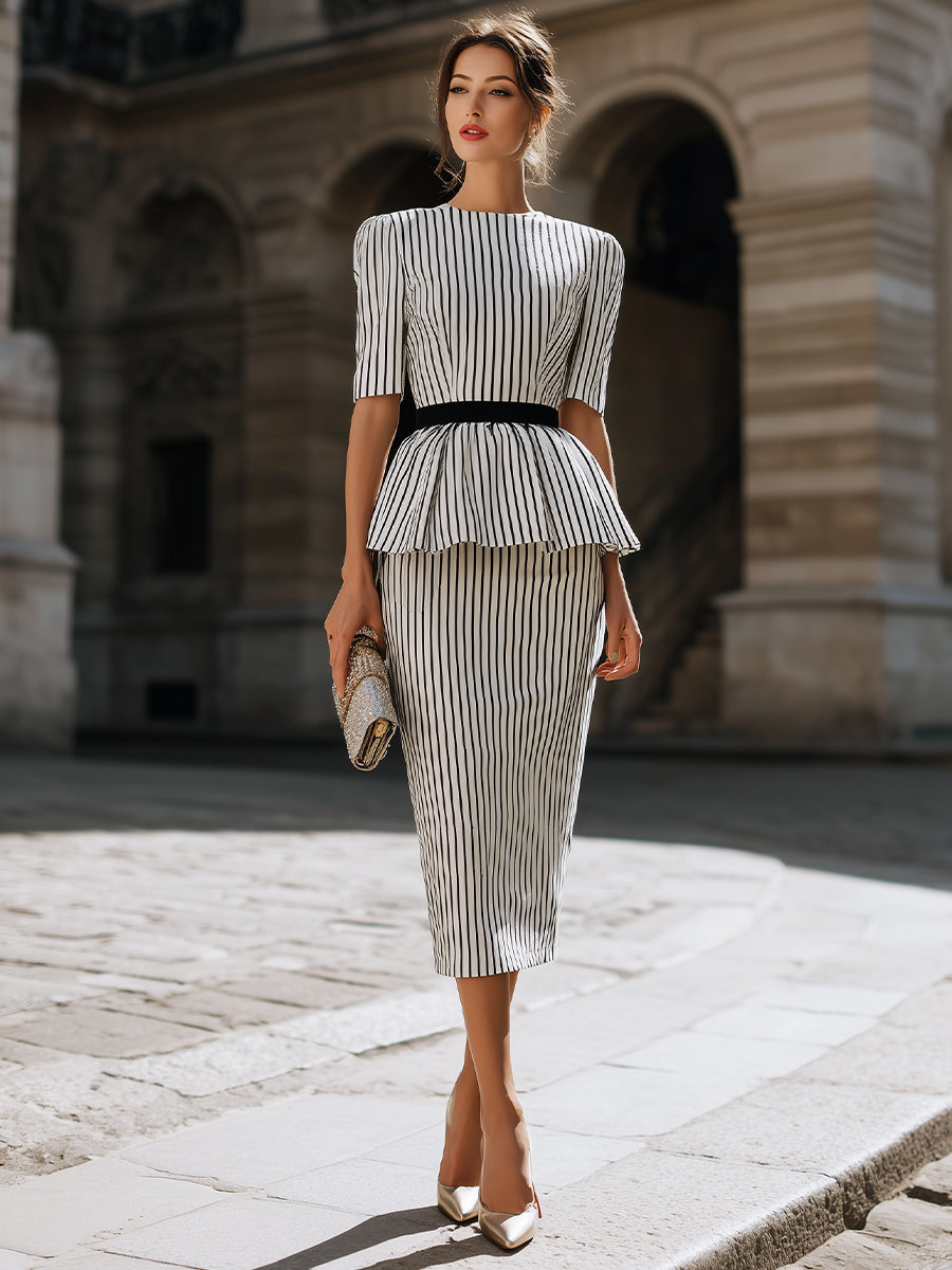 - Design: Two-piece set featuring a round-neck striped peplum top with elbow-length sleeves, defined contrast waistband, and coordinating high-waisted pencil skirt with vertical stripe detailing