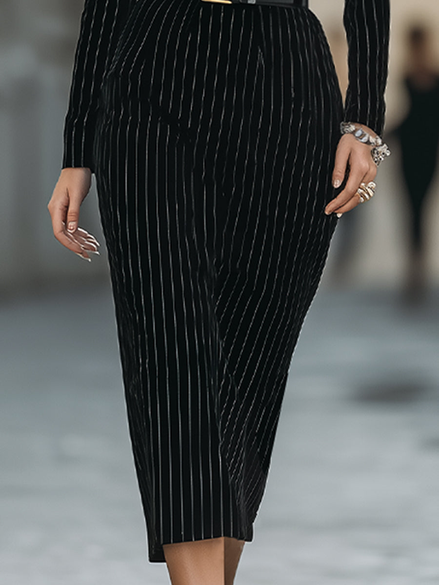 Elegant Velvet Pinstripe Belted Dress