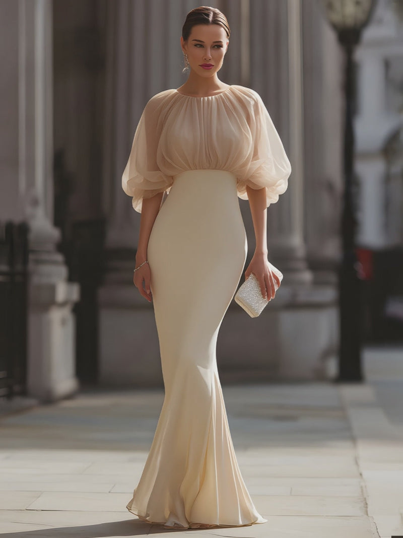 Gathered Sheer Sleeve Mermaid Evening Dress