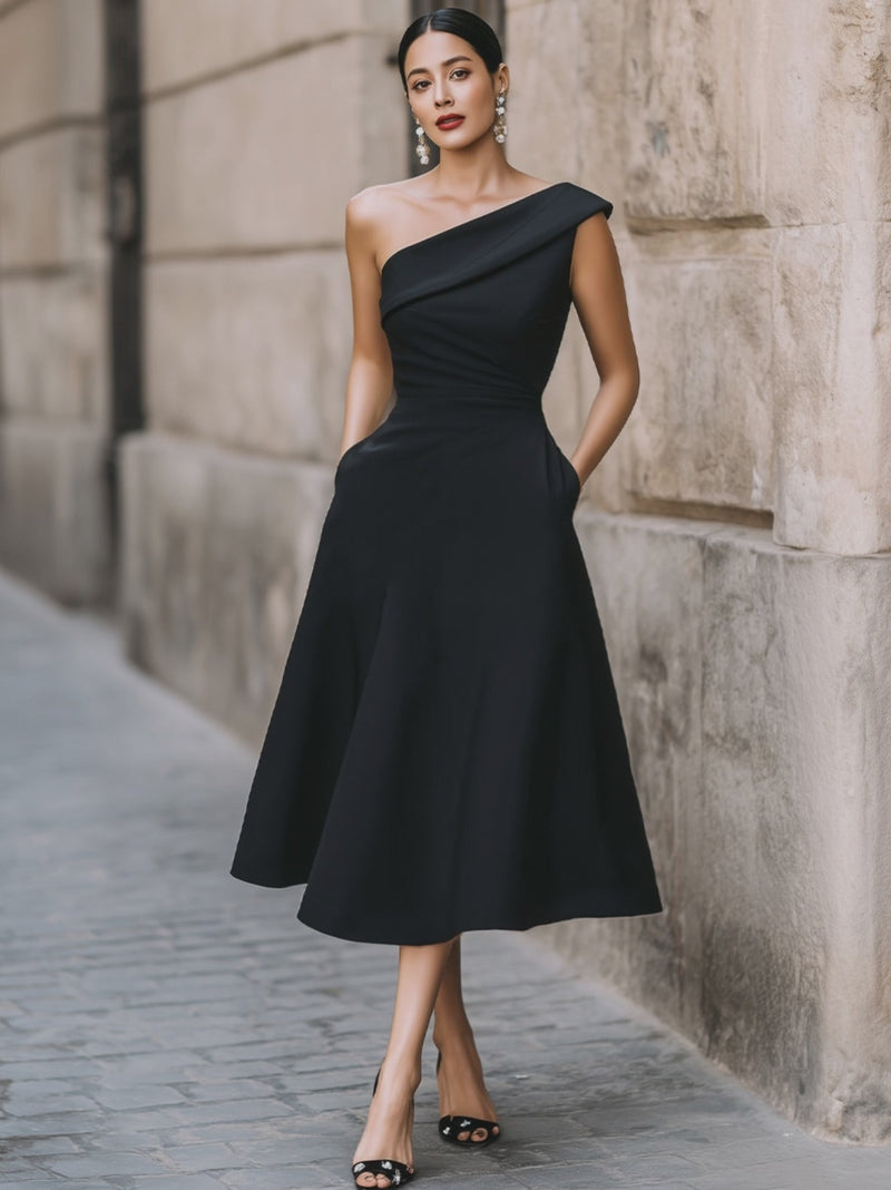 - Design: Asymmetric one-shoulder neckline, pleated bodice detailing, discreet side pockets, and a classic flared A-line skirt with a seamless back zipper