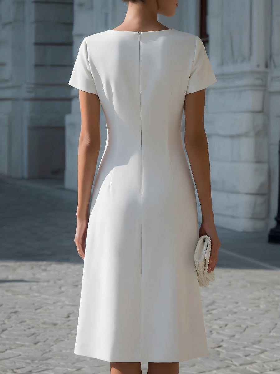 This elegant dress blends modern tailoring with refined textural contrast, creating a silhouette that feels both sophisticated and contemporary. Designed with a clean round neckline and short sleeves, the upper bodice presents a polished and minimalist aesthetic that highlights the shoulders while maintaining effortless comfort.