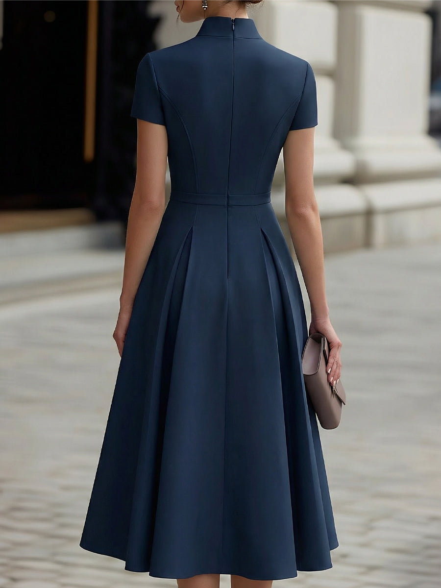 The design features a sleek stand collar paired with a full-length front zipper, creating a streamlined vertical line that elongates the body while adding a contemporary edge. The short sleeves are precisely cut to balance coverage and lightness, making the dress suitable for warmer seasons without sacrificing a polished appearance.At the waist, discreet horizontal zipper accents add a refined design detail, visually defining the midsection without overpowering the overall look. The skirt flows into a graceful fit and flare silhouette, finished with soft pleats that move fluidly with each step.