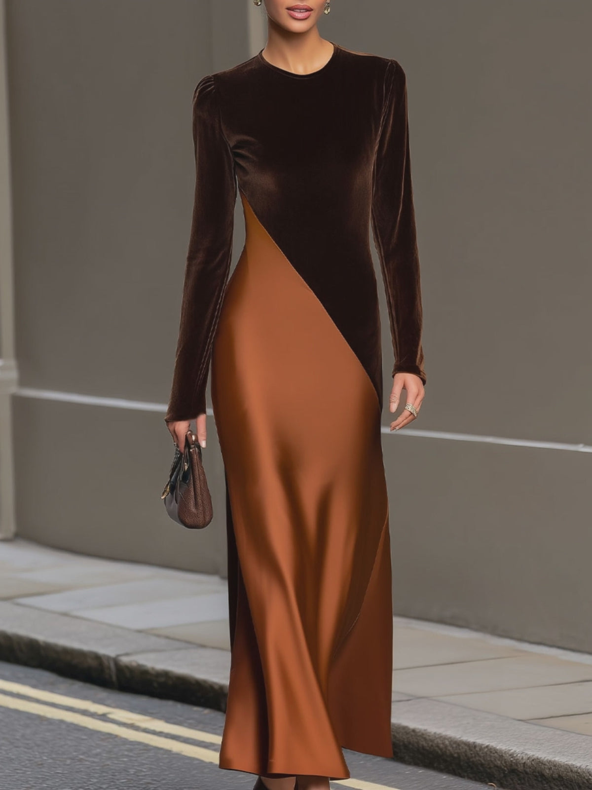 Designed for the woman who appreciates bold texture and refined contrast, this chocolate-hued maxi dress merges plush velvet with lustrous satin for a striking, sophisticated look. The long-sleeve bodice (crafted from rich chocolate velvet) features a sleek crew neckline, while the color-block skirt (made of smooth amber satin) adds a luminous, flowing contrast that elevates the silhouette. The asymmetric paneling blends the two textures seamlessly, creating a balanced, eye-catching design that exudes luxury.