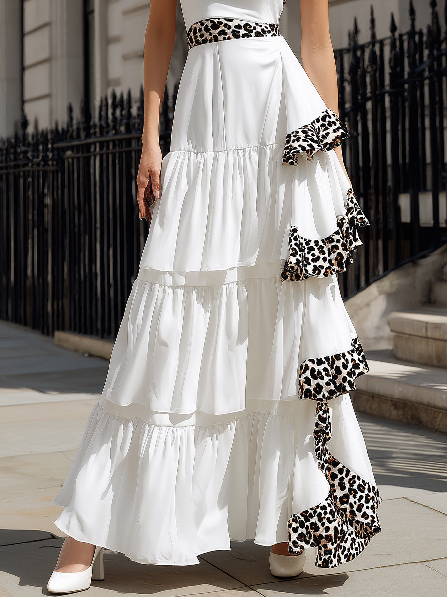 Elegant One-Shoulder Leopard Trim Tiered Maxi Dress