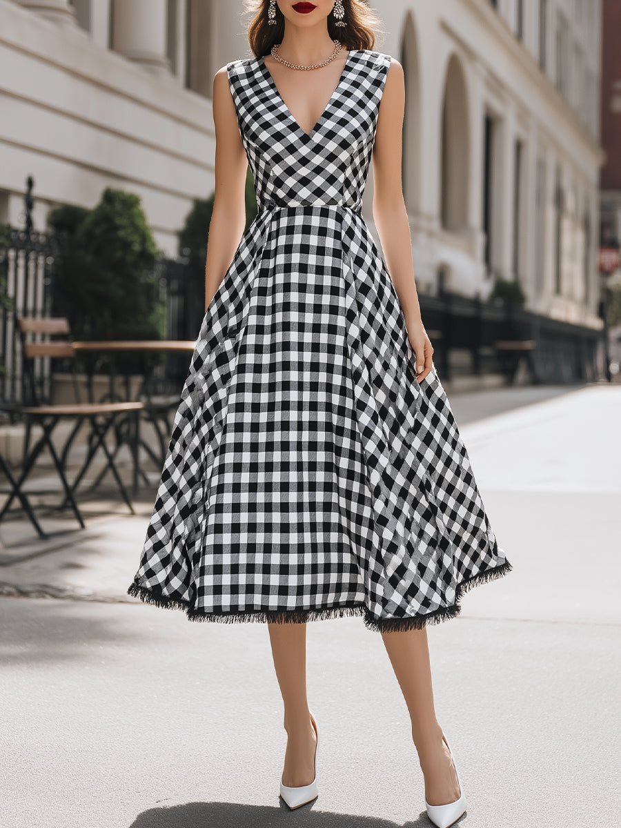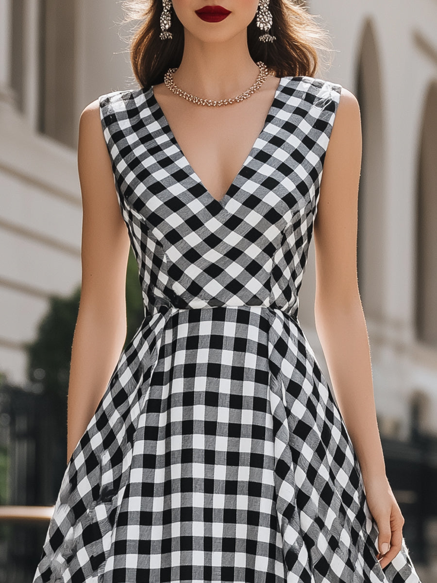 This elegant gingham midi dress combines timeless charm with modern feminine styling, making it a versatile addition to any wardrobe. Featuring a classic black and white gingham pattern, the dress captures a vintage-inspired aesthetic while maintaining a clean and contemporary silhouette. The sleeveless design and flattering V-neckline beautifully frame the shoulders and neckline, creating a refined and graceful appearance that is both stylish and comfortable.