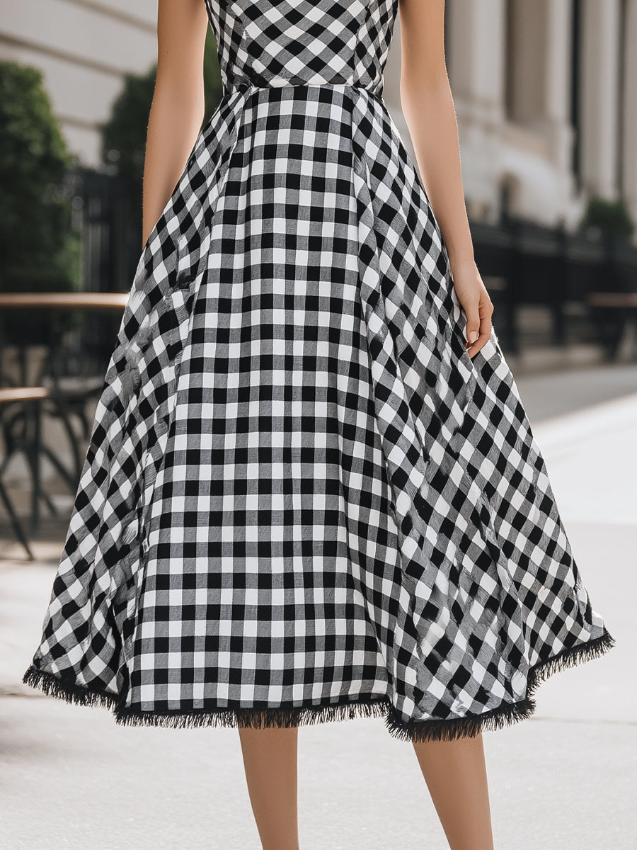- Design: Sleeveless V-neck design with classic black and white gingham pattern and subtle fringe detailing at the hem