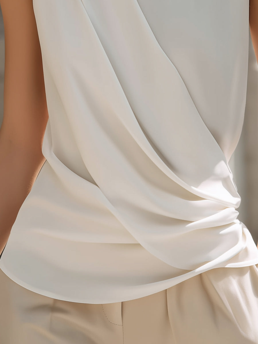 A beautifully sculpted asymmetric drape cascades diagonally across the bodice, creating depth and visual interest. The soft folds introduce graceful movement while flattering the natural shape of the body. This design detail adds dimension without overwhelming the overall minimalistic look. The relaxed fit gently skims the torso, providing comfort while maintaining a sleek silhouette. The fluid draping continues toward the hem, where subtle gathering enhances the elegant flow of the garment. Perfectly versatile, this blouse pairs effortlessly with tailored trousers, pencil skirts, or wide-leg pants. Whether styled for office wear or elevated casual occasions, it offers a timeless balance between sophistication and ease.