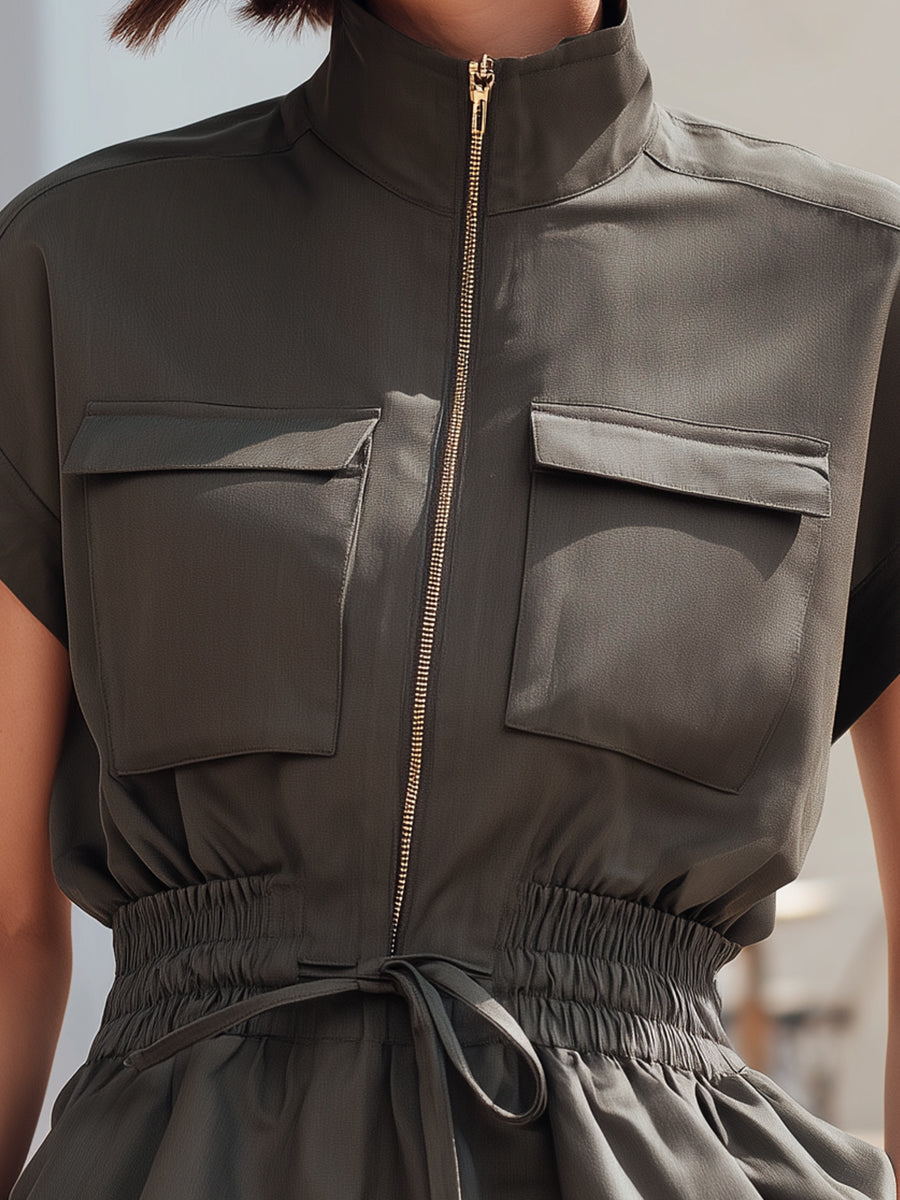 This modern utility-inspired blouse combines tailored structure with feminine shaping, creating a contemporary piece that balances functionality with elegant style. The blouse features a high neckline with a sleek zip-front closure that introduces a polished, modern edge. Short rolled sleeves enhance the structured silhouette while maintaining a relaxed and effortless aesthetic. Two chest flap pockets add a subtle utilitarian detail that complements the overall clean design. These functional accents bring a modern urban influence to the otherwise refined silhouette.