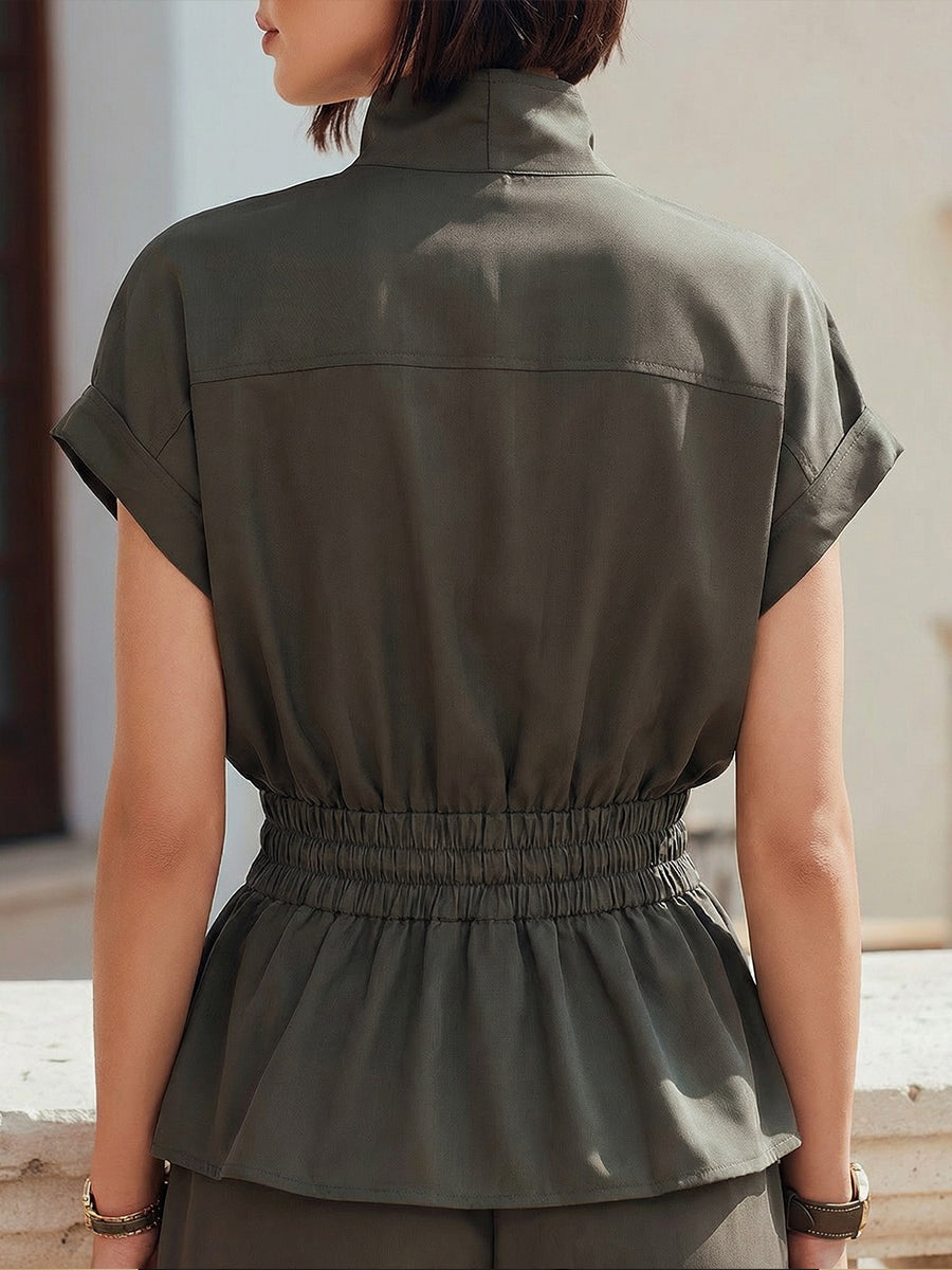 The elasticized waist cinches gently at the midsection, creating a flattering hourglass shape while maintaining comfort and flexibility. Below the waist, the peplum hem adds soft volume that enhances the feminine structure of the garment. This blouse pairs beautifully with tailored trousers, skirts, or structured pants for a sophisticated and versatile look. Perfect for office wear, city styling, travel outfits, and casual professional settings, this piece offers a refined balance between utility and elegance.