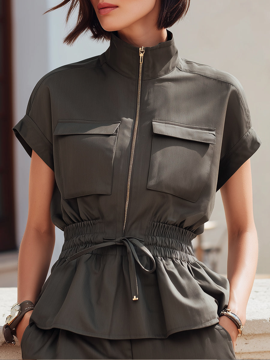 Zip-Front Utility Peplum Blouse