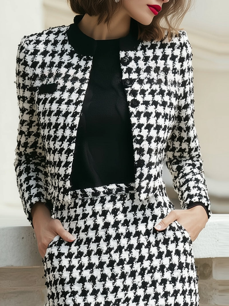 Houndstooth Tweed Skirt Suit Set With Contrast Trim