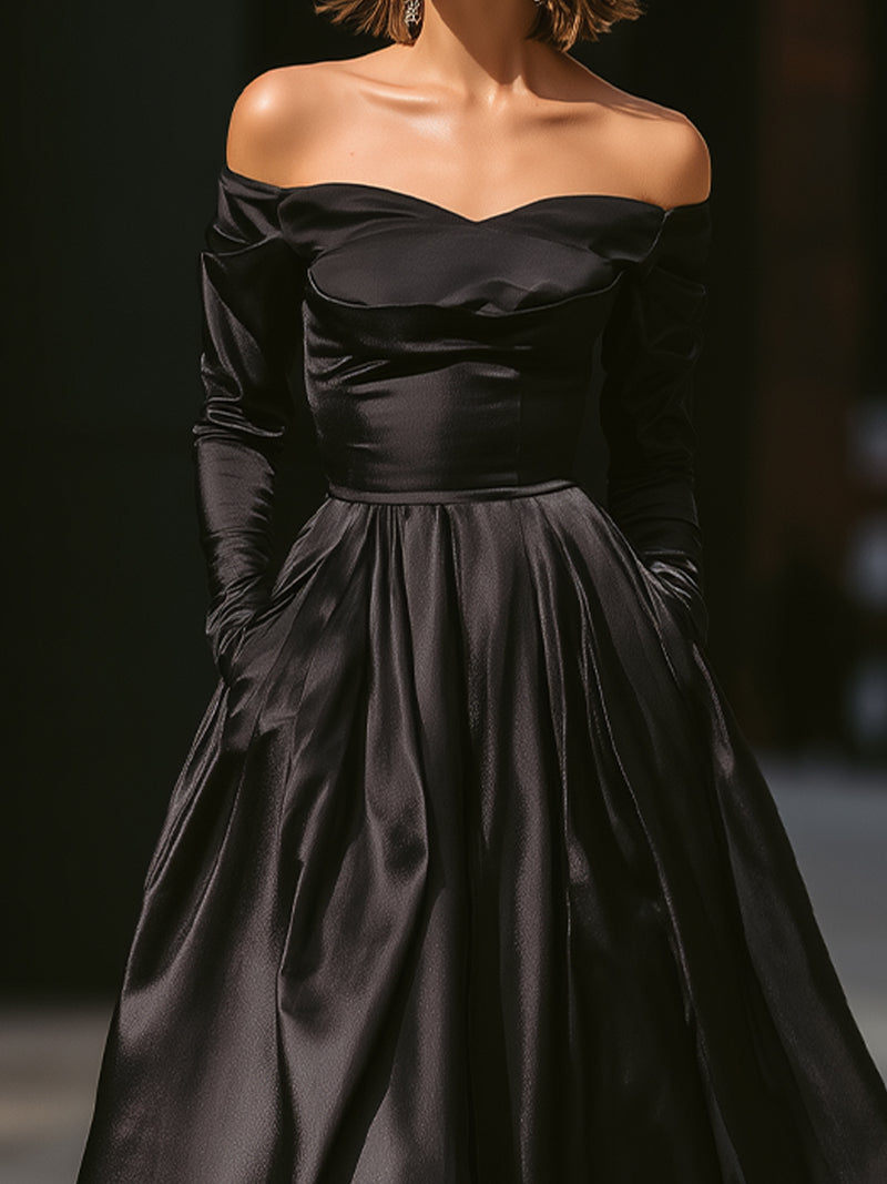Off-Shoulder Long-Sleeve Satin Gown With Front Slit