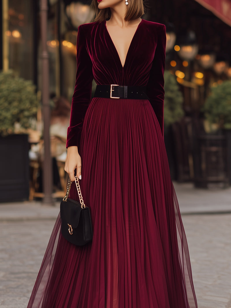 Velvet Deep V Pleated Mesh Maxi Dress With Belt