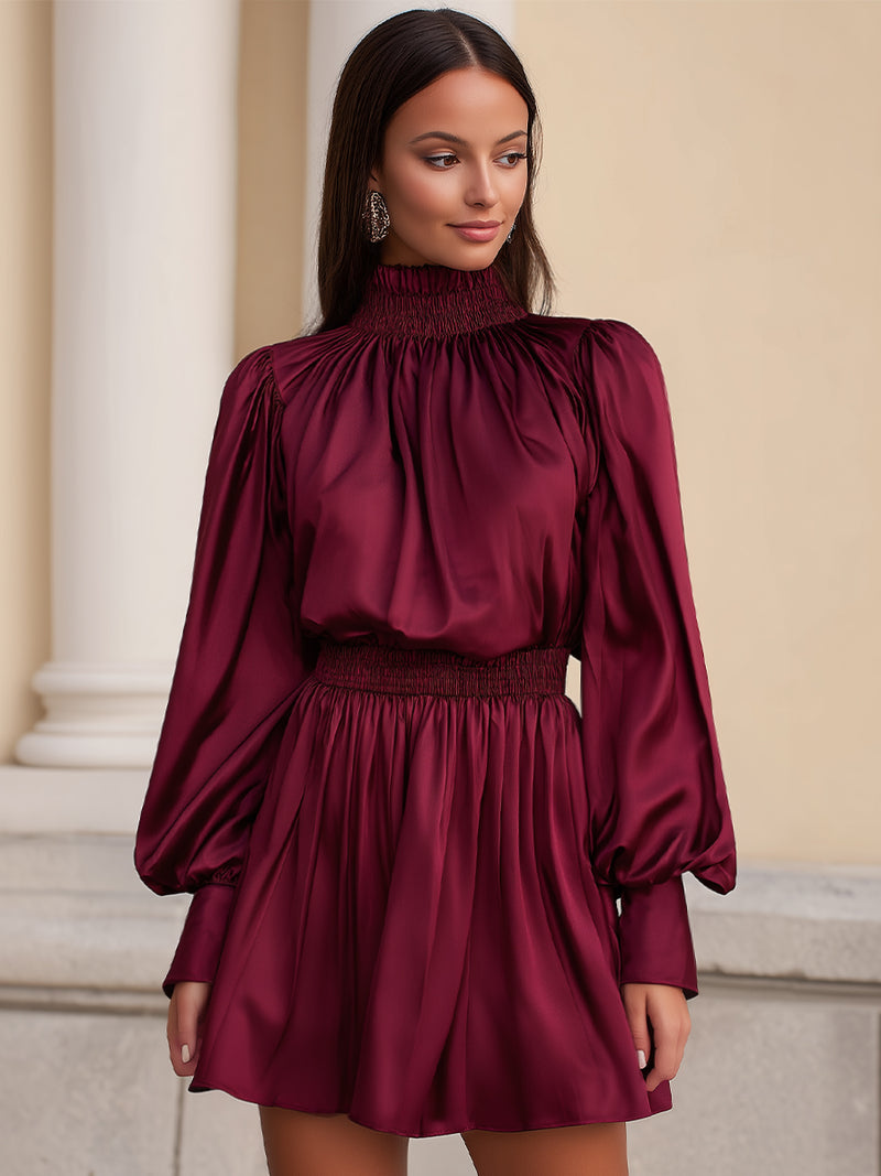 High-Neck Shirred Satin Mini Dress With Lantern Sleeves