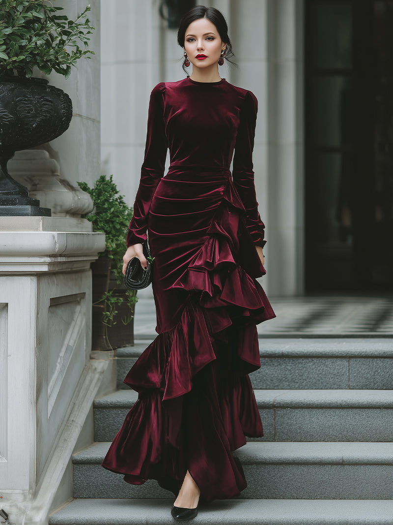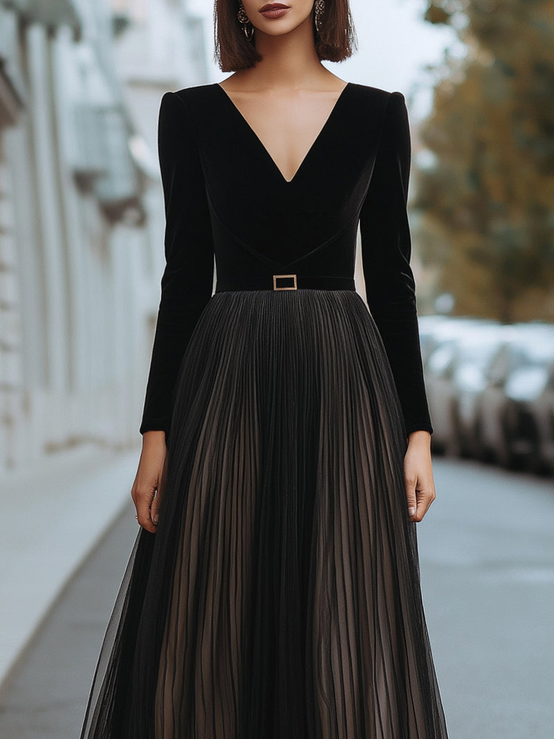 Velvet A-Line Dress With Pleated Mesh Skirt