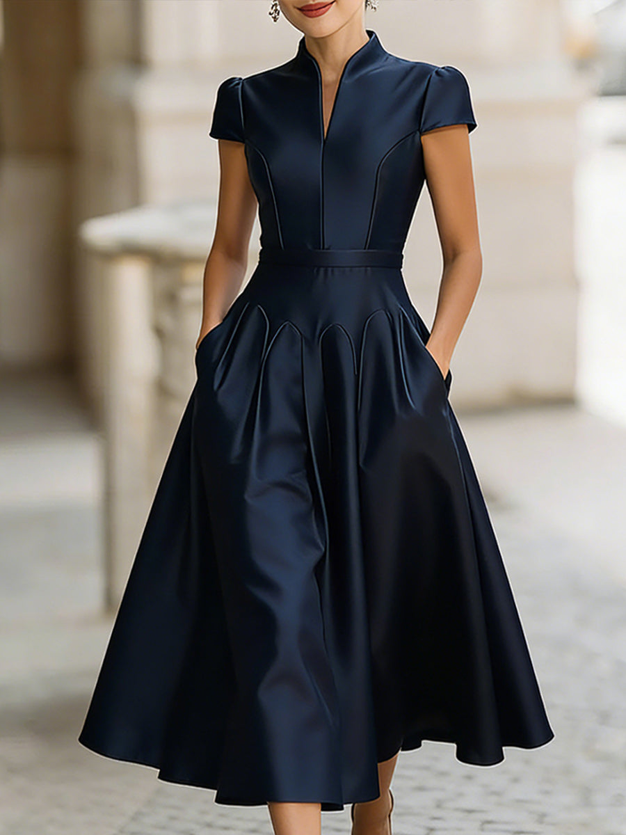 This Elegant Navy Structured A-Line Midi Dress brings together refined tailoring and timeless femininity, making it a standout piece for women who appreciate clean lines with couture-level detail. Crafted from a smooth, lustrous fabric, the dress features a sculpted bodice with a modern mandarin-inspired neckline and a subtle front slit that adds sophistication without compromising modesty.
