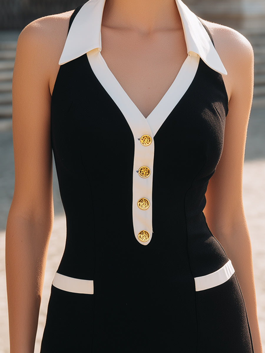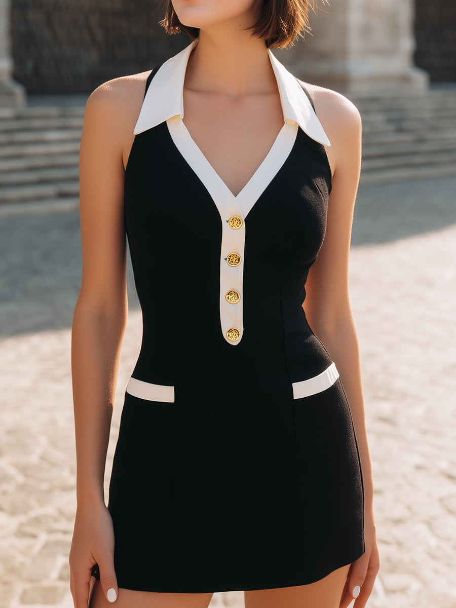 Black Halter Contrast-Collar Mini Dress With Gold-Tone Buttons