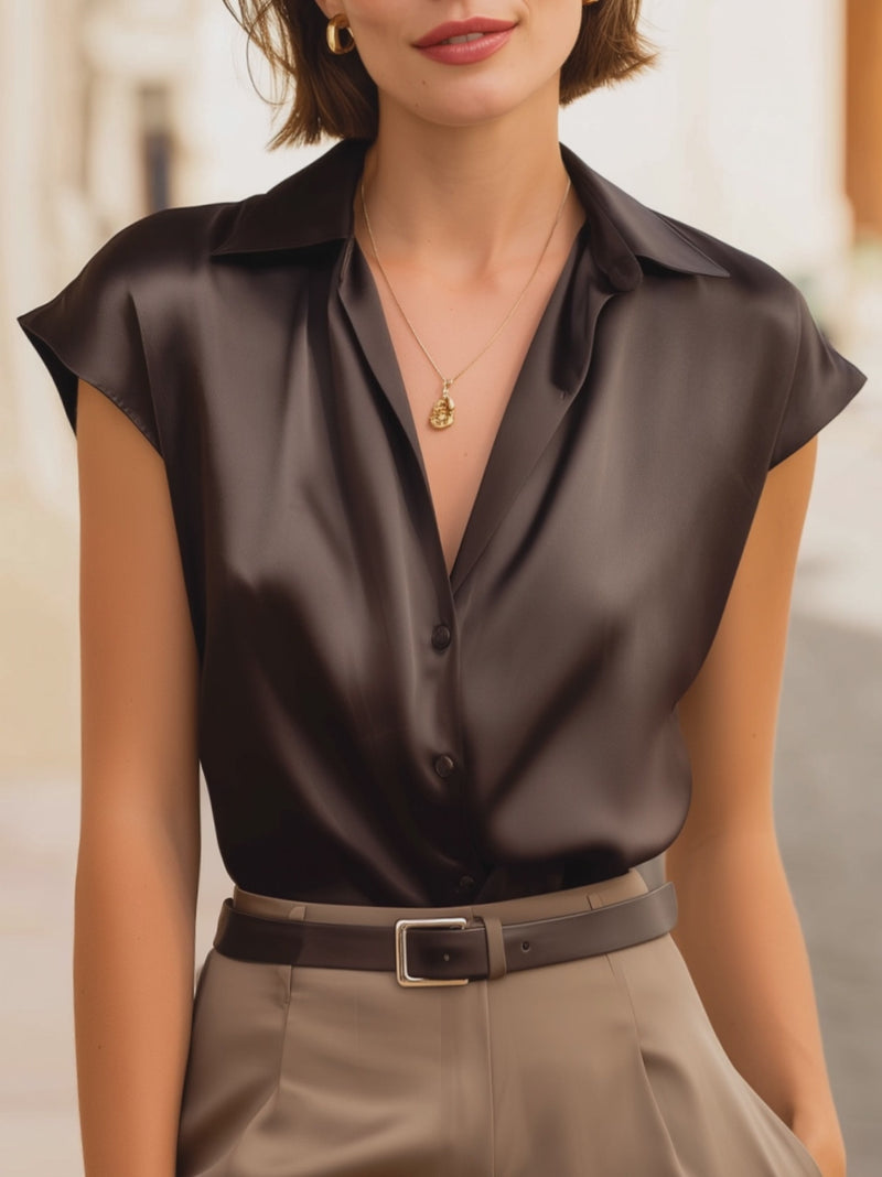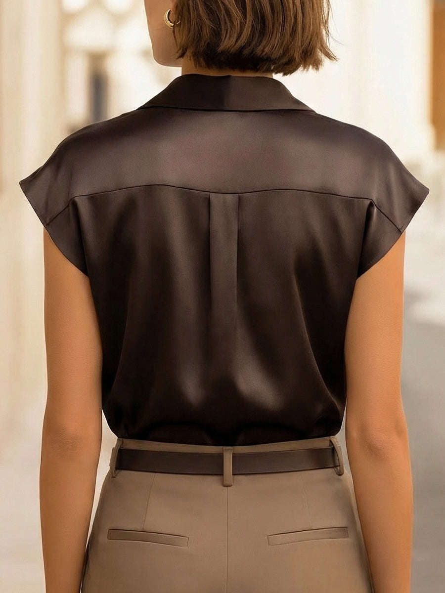 Sleeveless Draped Button-Front Satin Top Blouse