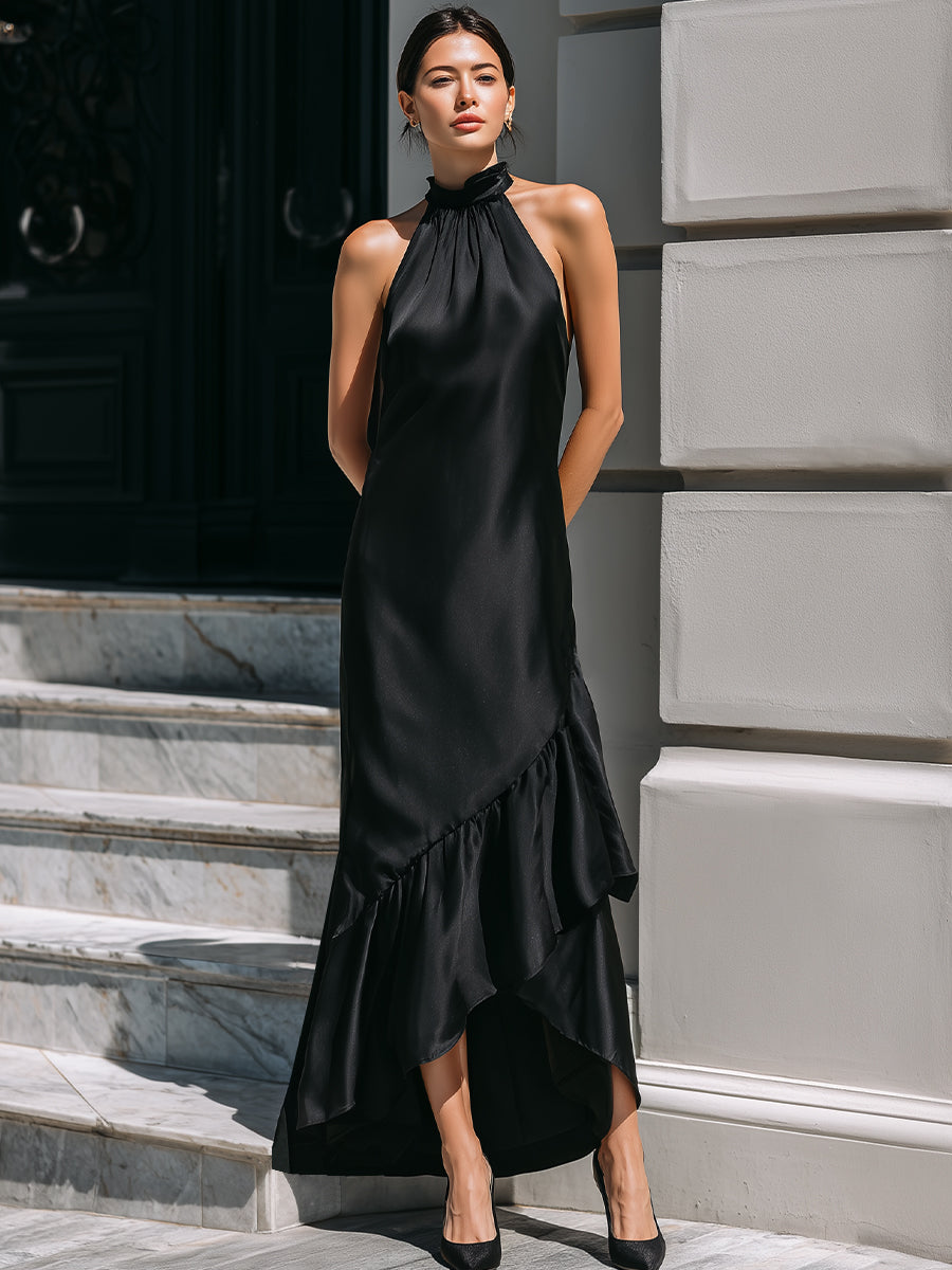 Elegant Halter Neck Asymmetric Ruffle Hem Maxi Dress