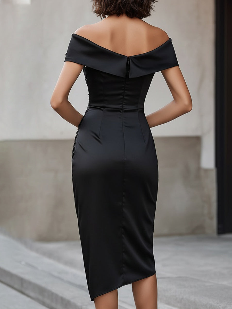 Expertly designed to highlight confident femininity, this off shoulder midi dress delivers a refined statement with modern allure. The sculpted ruching and asymmetrical neckline create visual drama while maintaining timeless sophistication. Perfect for elevated evenings or special occasions, this dress offers a sleek and elegant option for women who appreciate flattering design, clean lines, and effortless glamour.