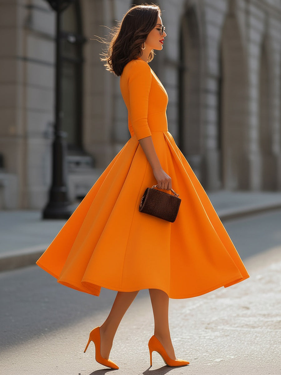 Crafted for the modern woman who embraces bold confidence and timeless allure, this dress redefines contemporary style with a striking, figure-flattering silhouette. It features a deep V-neckline, elbow-length fitted sleeves, a tailored waist that cinches the figure, and a voluminous midi-length A-line skirt with structured pleats, all in a vibrant orange hue that exudes enduring confidence.