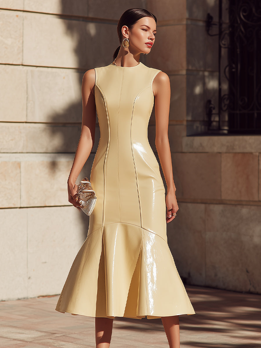 Mooyius presents a refined midi dress that highlights sculptural tailoring with modern feminine elegance. This sleeveless design features a clean round neckline and a precisely contoured bodice, enhanced by vertical seam detailing that visually defines the waist and elongates the silhouette. The fitted upper structure flows seamlessly into a softly flared mermaid hem, creating graceful movement and a balanced proportion that feels both sophisticated and confident.