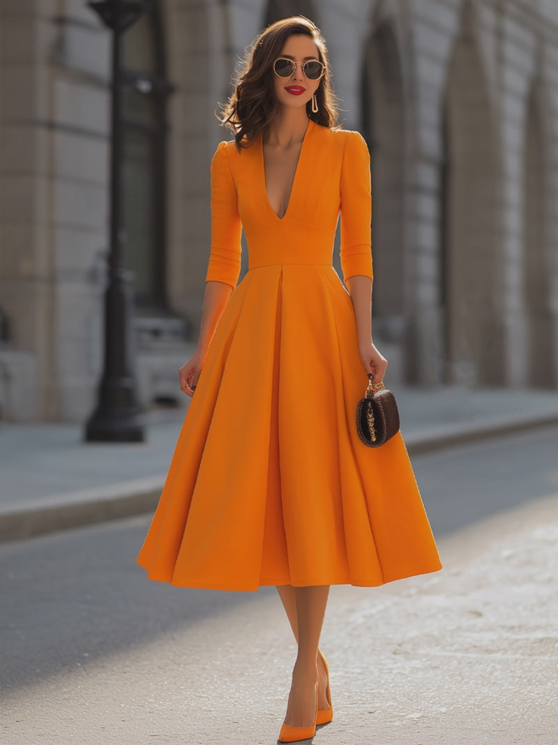 Orange Deep V-Neck Fit-and-Flare Midi Dress