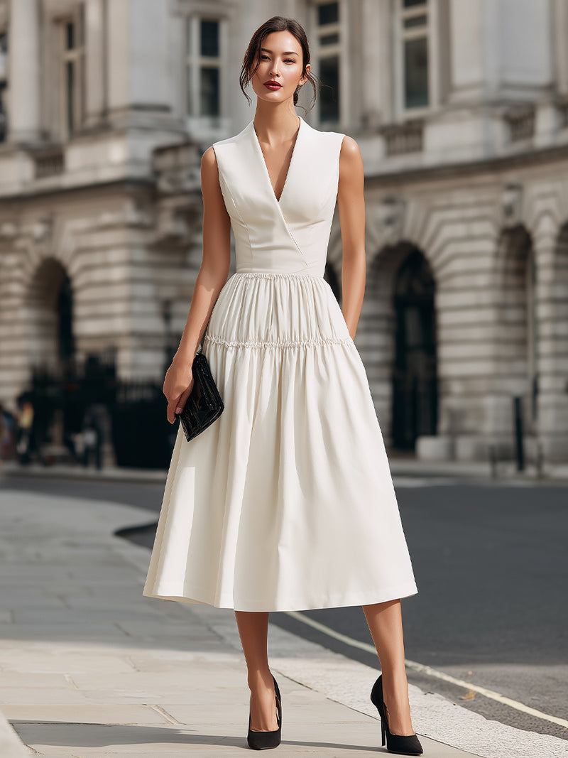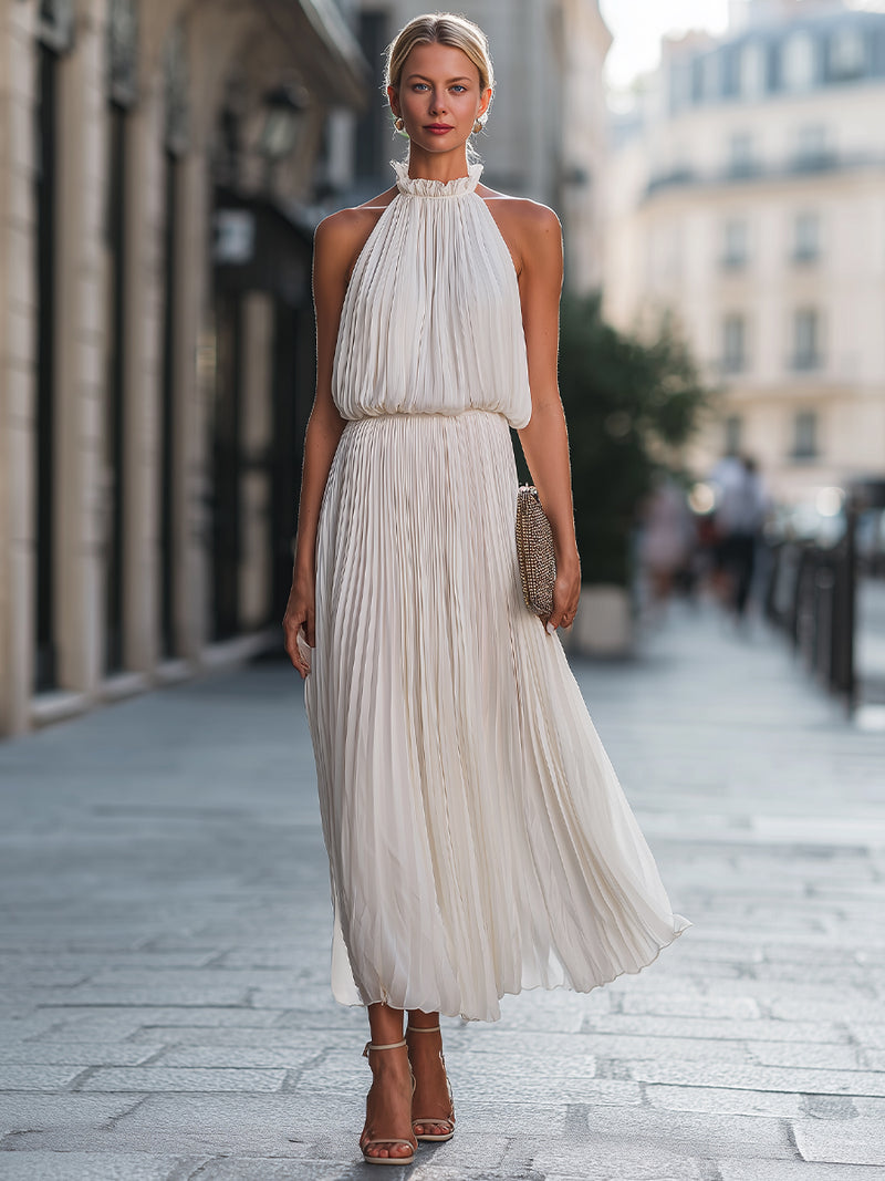 White Sleeveless Stand Collar Zip-Front Pleated Midi Dress