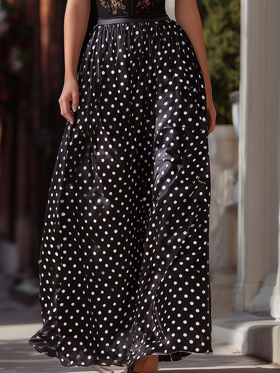 Flowing from the fitted bodice, the maxi-length skirt features a lightweight fabric adorned with delicate polka dots. The soft drape moves gracefully with every step, bringing a sense of fluidity and elegance to the overall silhouette. The contrast between the structured lace top and the airy skirt creates a visually balanced design that feels sophisticated yet effortless. Perfect for evening events, destination dinners, cocktail receptions, or elegant summer occasions, this dress transitions seamlessly from formal gatherings to upscale social moments.