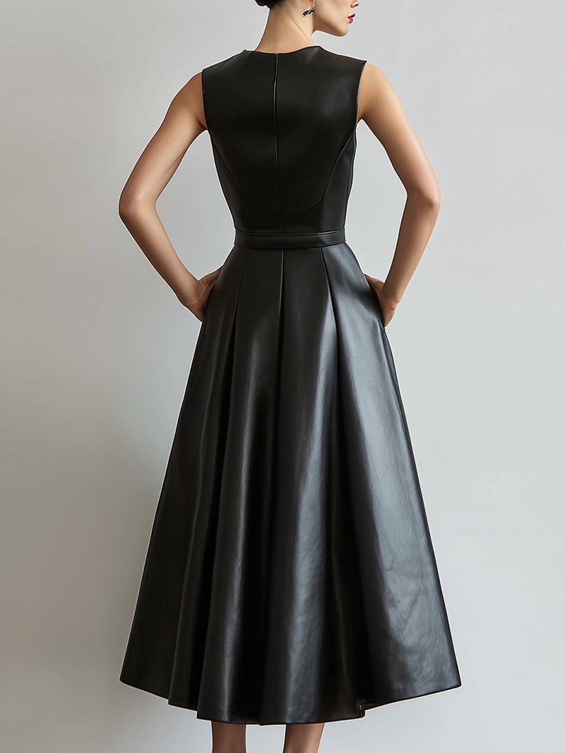 Sophisticated Faux Leather Black Midi Dress With Belted Waist
