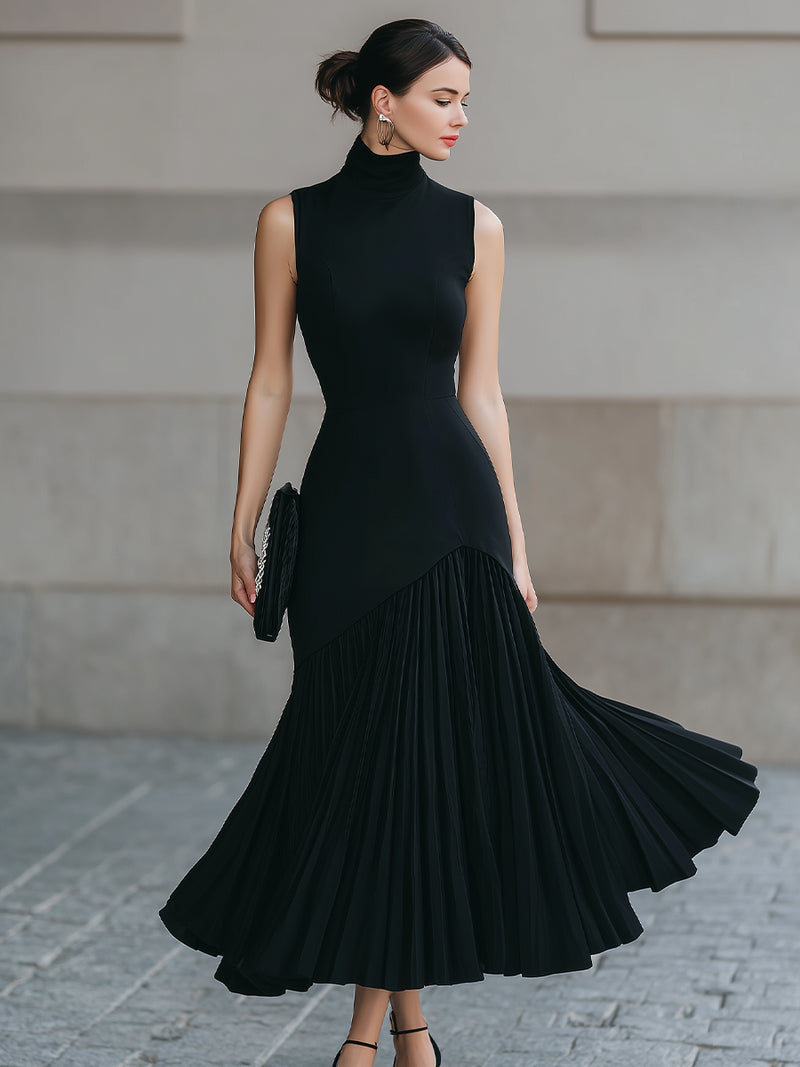 Black Pleated Midi Dress With Mock Neck
