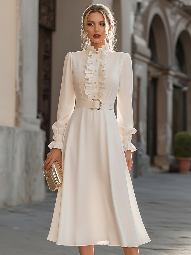 Ivory Ruffled Shirt Dress With Belt
