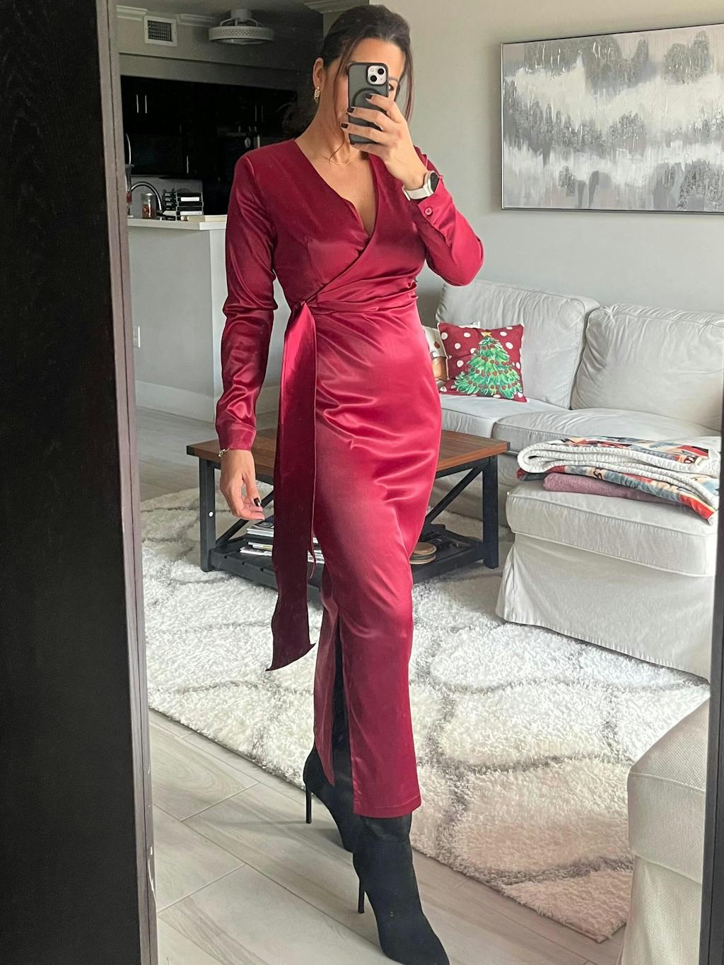 Timeless Burgundy Satin Wrap Dress with Waist Tie Detail
