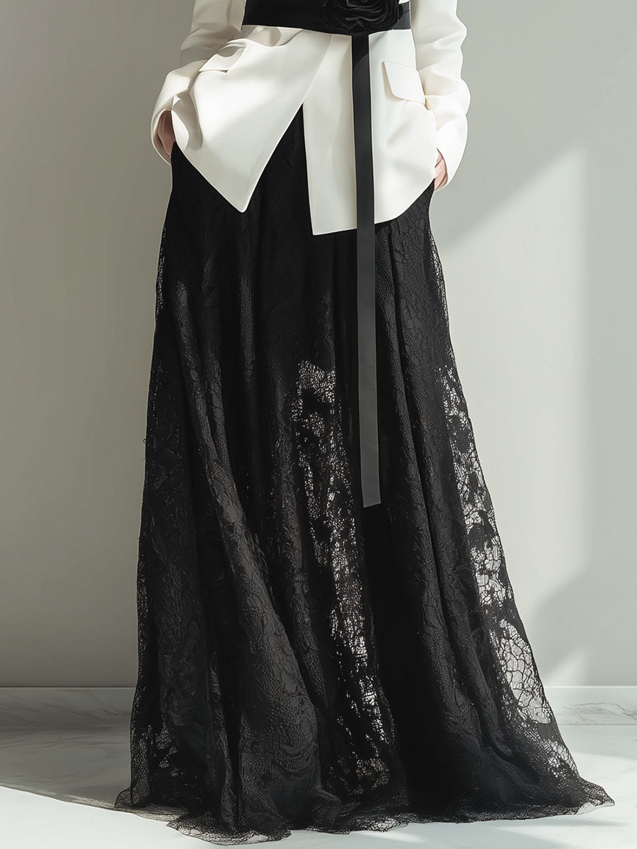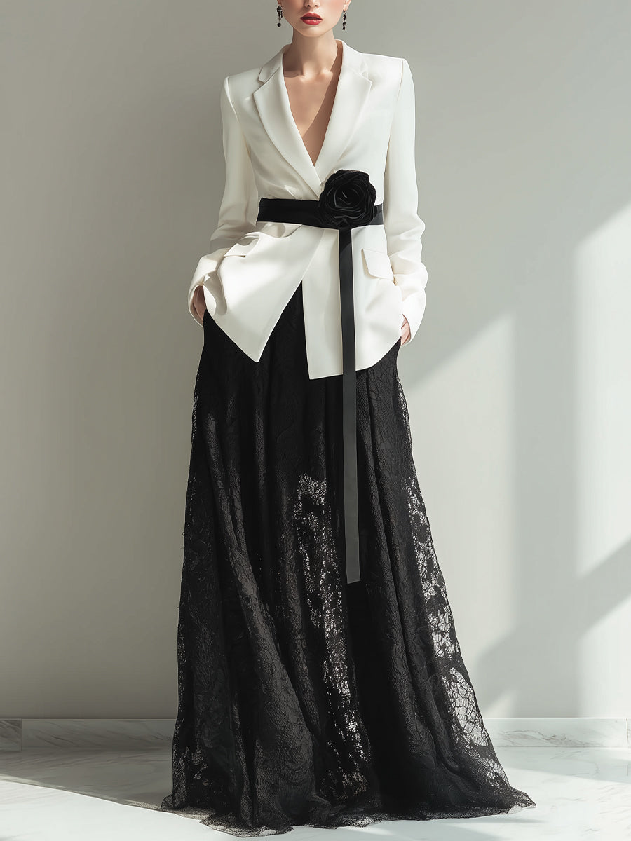 Striking the perfect balance between modern tailoring and timeless femininity, this two-piece ensemble elevates formal dressing with an air of refined sophistication. Designed for women who appreciate confident elegance, the set pairs a structured white blazer with a flowing black lace maxi skirt—creating a dramatic monochrome contrast that is both powerful and effortlessly graceful.