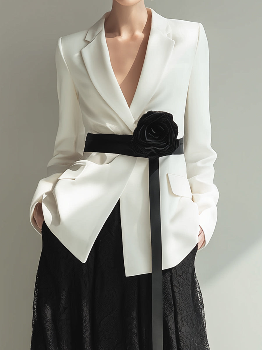 The blazer features a sculpted silhouette with sharp lapels, clean lines, and impeccable tailoring that contours the body with precision. Its deep V-neckline creates a lengthening effect, while the long sleeves and smooth shoulder structure lend an air of authority and polished style. A removable black belt adorned with a statement rosette cinches the waist, adding a couture-inspired touch that softens the blazer’s structured form with artistic romance.
